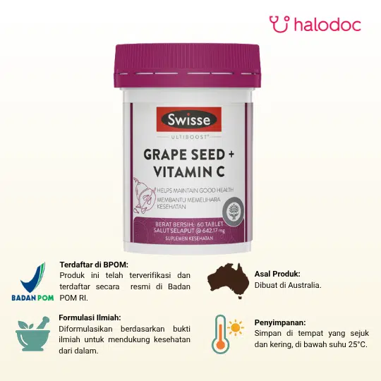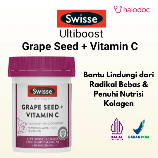 SWISSE ULTIBOOST GRAPE SEED + VITAMIN C adalah suplemen kesehatan premium yang diformulasikan untuk membantu memelihara kesehatan tubuh, mendukung pembentukan kolagen, dan membantu meringankan bengkak akibat varises.