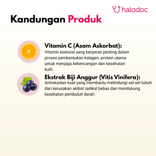 Produk ini mengandung Ekstrak Biji Anggur (Grape Seed) yang kaya akan proanthocyanidins, salah satu antioksidan alami yang paling kuat. Antioksidan ini membantu melindungi sel-sel tubuh dari kerusakan akibat radikal bebas dan secara tradisional membantu meringankan pembengkakan akibat varises. Formula ini diperkaya dengan Vitamin C, yang memainkan peran ganda: sebagai antioksidan tambahan dan sebagai nutrisi penting yang diperlukan tubuh untuk proses pembentukan kolagen, protein yang menjaga elastisitas dan kekencangan kulit.