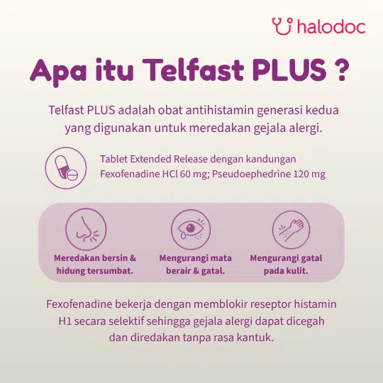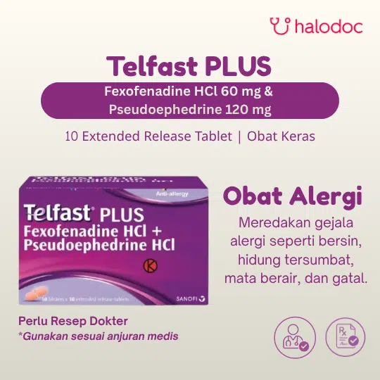 TELFAST PLUS 10 TABLET adalah sediaan obat kombinasi yang dirancang untuk meredakan gejala rinitis alergi, termasuk hidung tersumbat, bersin-bersin, pilek, serta gatal pada hidung, tenggorokan, dan mata. Setiap tablet mengandung dua zat aktif utama Fexofenadine HCl 60 mg dan Pseudoephedrine HCl 120 mg. Fexofenadine bekerja sebagai antihistamin generasi kedua, secara selektif memblokir reseptor H1 untuk menghambat efek histamin yang memicu gejala alergi tanpa menyebabkan sedasi signifikan. Sementara itu, Pseudoephedrine adalah dekongestan simpatomimetik yang bekerja dengan menyempitkan pembuluh darah di mukosa hidung, sehingga mengurangi pembengkakan dan kongesti (hidung tersumbat). Kombinasi kedua zat ini memberikan efek sinergis untuk meredakan spektrum gejala alergi dan hidung tersumbat secara efektif.