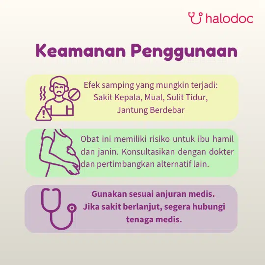 HARUS DENGAN RESEP DOKTER. Hati-hati penggunaan pada pasien dengan riwayat penyakit jantung, hipertensi, gangguan tiroid, atau diabetes. Dapat menyebabkan pusing dan kesulitan tidur.