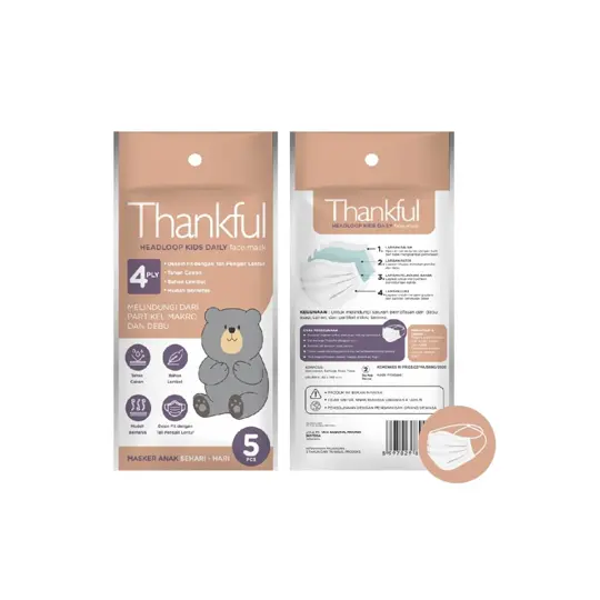 Thankful Earloop Kids Daily Face Mask merupakan masker yang dapat melindungi dari partikel makro dan debu. Design Fit dengan tali pengait lentur, tahan cairan, bahan lembut mudah bernafas nyaman digunakan dan menutup hidung dengan sempurna.