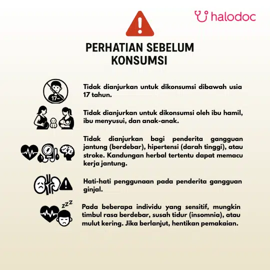 Tidak dianjurkan untuk: Wanita hamil dan menyusui, penderita gagal ginjal, tekanan darah tinggi yang tidak terkontrol, dan penyakit jantung.