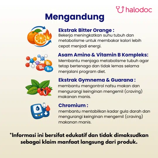 Vitamin C (as Ascorbic Acid) 30 mg Thiamin (as Thiamin HCl) 1.7 mg Niacin 5.0 mg Vitamin B6 (as Pyridoxine HCl) 2.5 mg Panthotenic Acid (as d-Calcium Panthotenate) 5.0 mg Magnesium (as Magnesium Oxide) 7.5 mg Chromium (as Chromium Polynicotinate) 60 mcg. Asam Amino Group (L-Tyrosine, L-Glutamine, L-Arginine, L-Lysine), Bitter Orange Peel Extract, Guarana Seed Extract, Garcinia Fruit Extract, Gymnema Leaf Extract, Green Tea Leaf Extract, Wheat Willow Bark Extract, Bladderwarck Thali, Grapefruit Seed Extract, Coleus Root Extract.