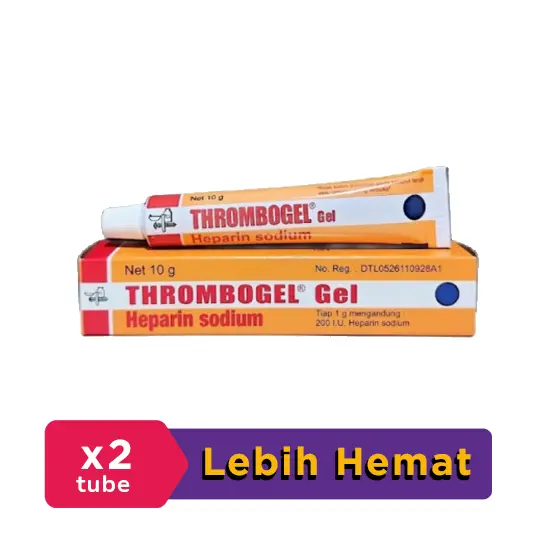THROMBOGEL GEL merupakan sediaan topikal berbentuk gel yang mengandung zat aktif Sodium Heparin. Heparin merupakan suatu antikoagulan yang dapat mencegah terbentuknya gumpalan-gumpalan dalam darah dan membantu memcahkan pembekuan darah yang telah terbentuk. Obat ini digunakan unutk mengatasi memar, mencegah pembekuan darah, flebitis superfisial, penyempitan pembuluh vena, cedera karena olahraga dan kecelakaan.