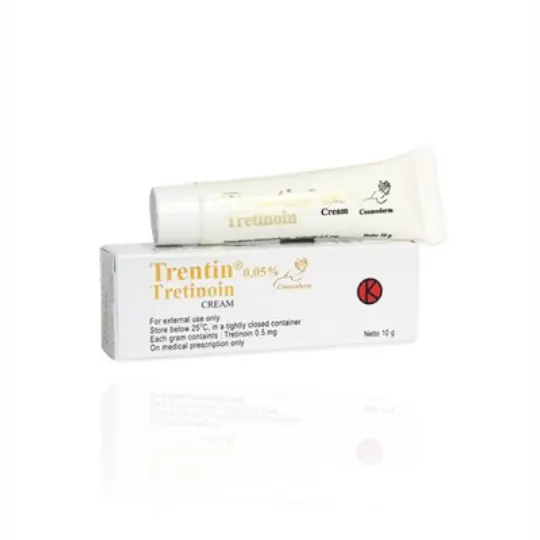 TRENTIN CREAM merupakan obat jerawat topikal dengan kandungan Retinoic Acid atau Asam Retinoat (tretinoin). Retinoic Acid meningkatkan mitosis dan pergantian sel epidermal serta menekan sintesis keratin. Permeabilitas kulit meningkat menyebabkan hilangnya cairan sehingga memudahkan pengelupasan kulit dan mencegah terbentuknya pengelupasan kulit. Oleh karena itu, Trentin Cream efektif digunakan untuk pengobatan jerawat komedogenik, papul, dan pustul. Dalam penggunaan obat ini harus SESUAI DENGAN PETUNJUK DOKTER. Pembelian obat ini memerlukan edukasi terkait penggunaan atau pengonsumsian obat yang tepat dan aman yang akan dikenakan biaya.