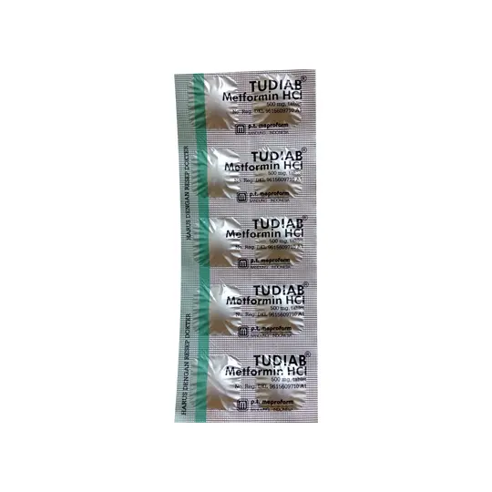 Tudiab merupakan obat dengan kandungan metformin. Metformin adalah obat antidiabetes generik yang digunakan untuk mengontrol dan menurunkan kadar gula darah pada penderita diabetes tipe 2. Metformin termasuk obat antidiabetes golongan Biguanide, bekerja dengan cara menghambat produksi glukosa (glukoneogenesis) di hati. Penghambatan tersebut mengakibatkan terjadinya penundaan absorbsi atau penyerapan glukosa di usus, sehingga menurunkan glukosa plasma baik basal maupun postprandial (setelah makan). Selain itu, Metformin juga bekerja dengan memperbaiki sensitivitas insulin dengan cara meningkatkan ambilan dan penggunaan glukosa di jaringan perifer. Dengan demikian, maka akan terjadi perbaikan toleransi glukosa pada pasien diabetes tipe 2. Obat ini dapat dikonsumsi secara tunggal, dikombinasikan dengan obat antidiabetes lain, atau diberikan bersama insulin. Dalam penggunaan obat ini harus SESUAI DENGAN PETUNJUK DOKTER. Pembelian obat ini memerlukan edukasi terkait penggunaan atau pengonsumsian obat yang tepat dan aman yang akan dikenakan biaya.