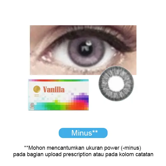 Softlens Vanilla merupakan softlens warna dengan masa penggunaan selama 6 Bulan. Softlens ini memiliki 4 pilihan warna yaitu Purple, Sky Blue, Ice Grey, Choco. Softlens ini memiliki diameter 14.5 mm dan kadar air 55%.