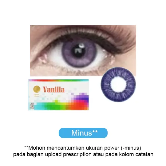 Softlens Vanilla merupakan softlens warna dengan masa penggunaan selama 6 Bulan. Softlens ini memiliki 4 pilihan warna yaitu Purple, Sky Blue, Ice Grey, Choco. Softlens ini memiliki diameter 14.5 mm dan kadar air 55%.