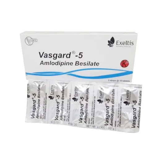 Vasgard merupakan obat yang mendung amlodipin. Amlodipin merupakan obat antihipertensi Calcium Channel Blockers (CCB). Obat ini digunakan sebagai pengobatan lini pertama hipertensi dan dapat digunakan sebagai agen tunggal untuk mengontrol tekanan darah pada sebagian besar pasien. Pasien yang tidak cukup terkontrol dengan obat antihipertensi tunggal (selain amlodipin) dapat memperoleh manfaat dari penambahan amlodipin, yang telah digunakan dalam kombinasi dengan diuretik thiazide, blocker, adrenoceptor blocking agent, atau ACE inhibitor. Pengobatan lini pertama iskemia miokard baik karena obstruksi tetap (angina stabil) dan atau vasospasme/vasokonstriksi (angina Prinzmetal atau varian) atau pembuluh darah koroner. Dapat digunakan jika presentasi klinis menunjukkan kemungkinan vasospastik/vasokonstriksi belum dikonfirmasi. Sebagai monoterapi atau kombinasi dengan obat antiangina lain pada pasien dengan angina yang refrakter terhadap nitrat dan atau penyekat dosis memadai. Dalam penggunaan obat ini harus SESUAI DENGAN PETUNJUK DOKTER. Pembelian obat ini memerlukan edukasi terkait penggunaan atau pengonsumsian obat yang tepat dan aman yang akan dikenakan biaya.