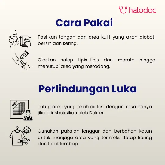 Cuci dan keringkan area yang terinfeksi sebelum aplikasi. Oleskan krim secukupnya hingga menutupi area yang sakit dan sedikit area kulit sehat di sekitarnya, lalu pijat dengan lembut. Cuci tangan setelah penggunaan. Lanjutkan pengobatan setidaknya selama 1 minggu setelah semua gejala hilang untuk mencegah kekambuhan.