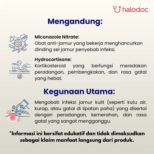 Hydrocortisone: Adalah kortikosteroid potensi ringan (Kelas VII) yang bekerja menekan respons inflamasi pada kulit. Ini efektif untuk meredakan gejala pruritus (gatal), eritema (kemerahan), dan pembengkakan yang sering menyertai infeksi jamur.