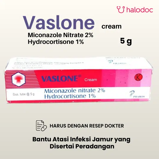 VASLONE CREAM 5 G adalah krim dermatologis kombinasi yang memiliki aksi antijamur dan anti-inflamasi (anti-radang) ringan.