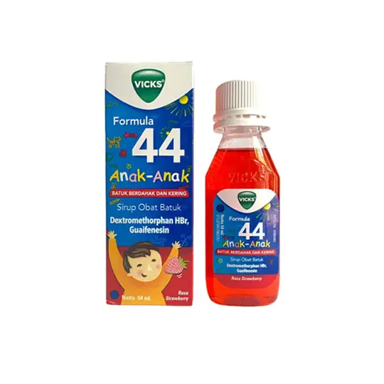 VICKS FORMULA 44 SIRUP adalah obat yang mengandung Dextromethorphan HBr dan Guaifenesin, digunakan untuk mengatasi batuk berdahak maupun tidak berdahak pada anak.