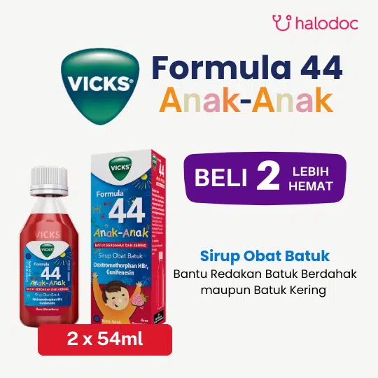 VICKS FORMULA 44 SIRUP adalah obat yang mengandung Dextromethorphan HBr dan Guaifenesin, digunakan untuk mengatasi batuk berdahak maupun tidak berdahak pada anak.