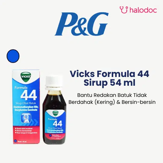 VICKS FORMULA 44 SIRUP adalah sirup obat batuk yang diformulasikan untuk meredakan batuk kering, terutama yang mengganggu istirahat malam.