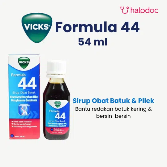 VICKS FORMULA 44 SIRUP adalah sirup obat batuk yang diformulasikan untuk meredakan batuk kering, terutama yang mengganggu istirahat malam.