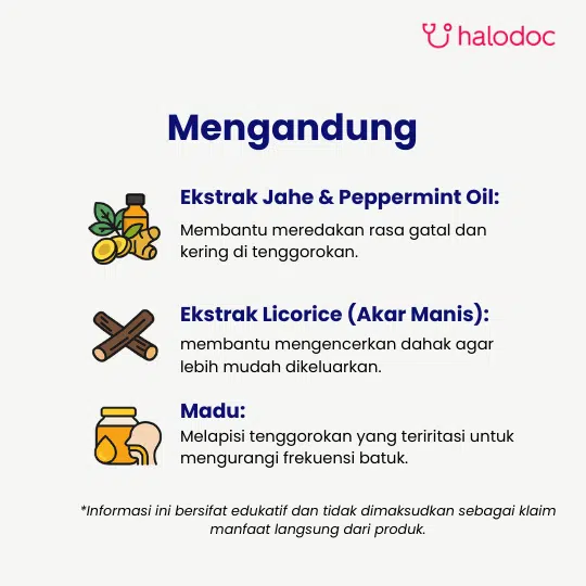 Per 7 ml : Ekstrak Jahe (Ext.Zingiber officinale Rhizome) 47 mg, Ekstrak Licorice 28 mg, Peppermint oil 12.1 mg, Madu 2.1 g