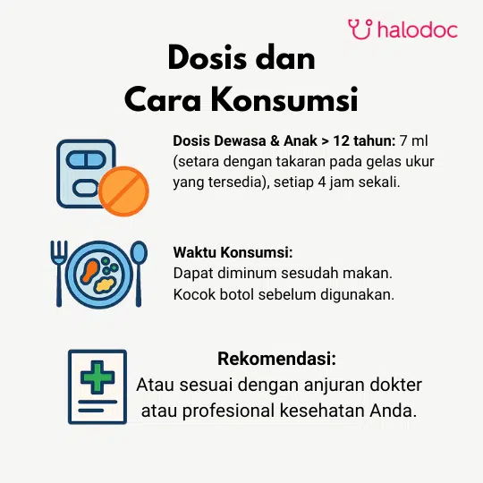 Dewasa dan anak diatas 12 tahun : 3 x sehari 7 ml.