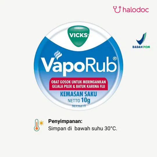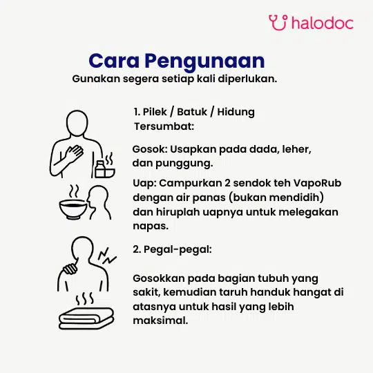 Produk ini dapat digunakan dengan tiga cara: 1. Dioleskan: Gosokkan pada dada, leher, dan punggung untuk mendapatkan sensasi hangat yang melegakan. 2. Dihirup: Hirup uapnya secara langsung dari wadah untuk membantu melegakan hidung tersumbat. 3. Dicampur air panas: Larutkan 2 sendok teh Vicks Vaporub ke dalam semangkuk air panas (tidak mendidih), lalu hirup uapnya untuk melegakan pernapasan.
