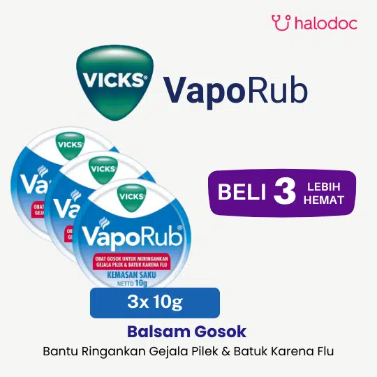 Vicks Vaporub adalah balsam gosok yang telah dikenal secara turun-temurun sebagai produk untuk meringankan gejala pilek dan batuk karena flu. Produk ini mengandung kombinasi bahan-bahan seperti Camphor, Menthol, dan Eucalyptus Oil yang memberikan sensasi hangat, melegakan, dan menenangkan.