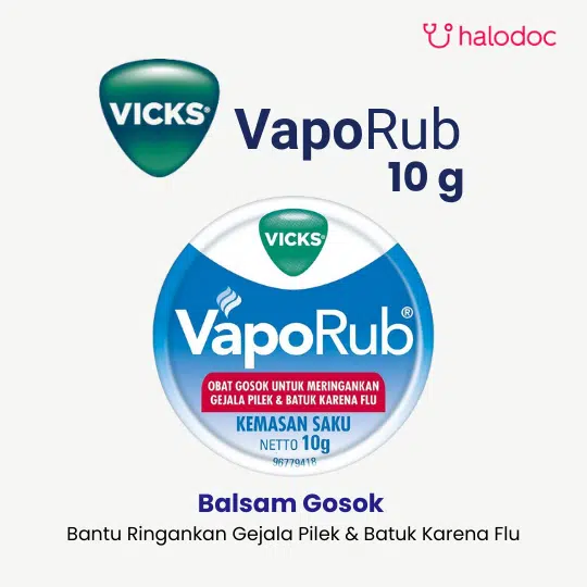 Vicks Vaporub adalah balsam gosok yang telah dikenal secara turun-temurun sebagai produk untuk meringankan gejala pilek dan batuk karena flu. Produk ini mengandung kombinasi bahan-bahan seperti Camphor, Menthol, dan Eucalyptus Oil yang memberikan sensasi hangat, melegakan, dan menenangkan.