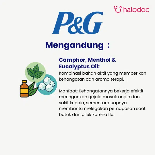 Camphor dan Menthol bekerja sebagai rubefacient yang memberikan rasa hangat pada kulit, sehingga membantu meringankan nyeri dan pegal. Uap dari Menthol dan Eucalyptus Oil saat dihirup berfungsi sebagai dekongestan yang membantu melegakan hidung tersumbat dan pernapasan.