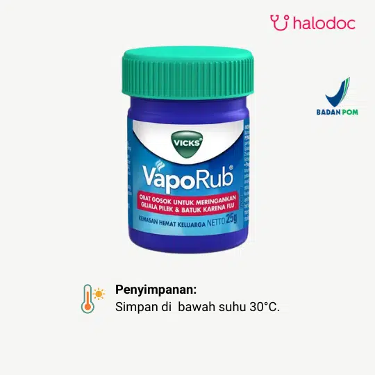 Produk ini dapat digunakan dengan tiga cara: 1. Dioleskan: Gosokkan pada dada, leher, dan punggung untuk mendapatkan sensasi hangat yang melegakan. 2. Dihirup: Hirup uapnya secara langsung dari wadah untuk membantu melegakan hidung tersumbat. 3. Dicampur air panas: Larutkan 2 sendok teh Vicks Vaporub ke dalam semangkuk air panas (tidak mendidih), lalu hirup uapnya untuk melegakan pernapasan.