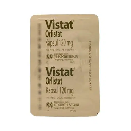 INFORMASI PADA KEMASAN INI HANYA UNTUK KALANGAN MEDIS. Untuk manajemen obesitas, termasuk penurunan berat badan dan pemeliharaan berat badan, bila digunakan bersamaan dengan diet rendah kalori. Juga diindikasikan untuk mengurangi risiko kenaikan kembali berat badan setelah penurunan berat badan sebelumnya. Vistat diindikasikan untuk pasien obesitas dengan Indeks Massa Tubuh (IMT) ≥30 kg/m², atau overweight dengan IMT ≥27 kg/m² yang disertai faktor risiko lain (seperti hipertensi, diabetes, dislipidemia)