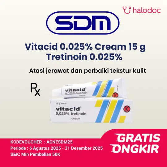 VITACID CREAM 0.025% adalah obat jerawat topikal yang mengandung Retinoic Acid (Asam Retinoat) dalam konsentrasi rendah. Obat ini digunakan untuk mengatasi jerawat, komedo, dan membantu mengurangi tanda-tanda penuaan dini.