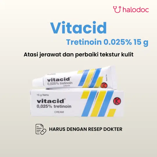 VITACID CREAM 0.025% adalah obat jerawat topikal yang mengandung Retinoic Acid (Asam Retinoat) dalam konsentrasi rendah. Obat ini digunakan untuk mengatasi jerawat, komedo, dan membantu mengurangi tanda-tanda penuaan dini.