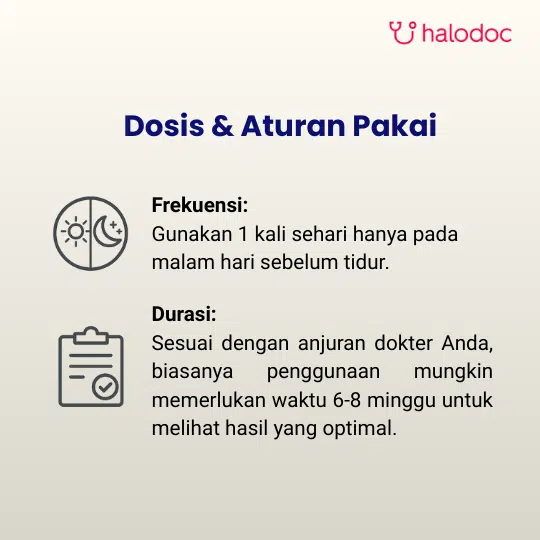 PENGGUNAAN OBAT INI HARUS SESUAI DENGAN PETUNJUK DOKTER. Dewasa: Oleskan krim secukupnya 1 kali sehari pada malam hari.
