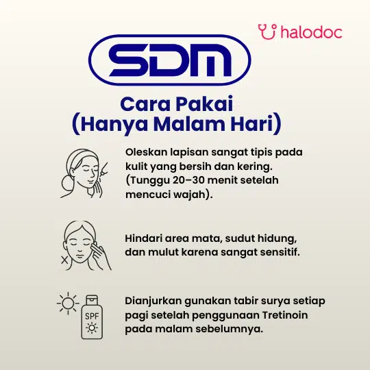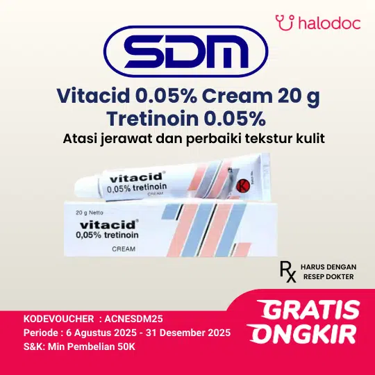 Tretinoin (Retinoic Acid) 0.05% adalah obat topikal turunan vitamin A yang digunakan untuk mengatasi jerawat (acne vulgaris), komedo, serta membantu memperbaiki tekstur dan penampilan kulit akibat penuaan dini atau kerusakan akibat sinar matahari. Obat ini bekerja dengan mempercepat pergantian sel kulit, mencegah penyumbatan pori-pori, dan merangsang regenerasi kolagen sehingga kulit menjadi lebih halus. Tretinoin 0.05% biasanya dioleskan tipis sekali sehari pada malam hari setelah kulit dibersihkan dan dikeringkan, sesuai anjuran dokter. Hindari penggunaan pada area mata, mulut, luka terbuka, atau lipatan kulit, serta batasi paparan sinar matahari karena kulit dapat menjadi lebih sensitif; penggunaan tabir surya sangat dianjurkan. Efek samping yang dapat terjadi adalah kulit kering, kemerahan, rasa perih, pengelupasan, atau iritasi, terutama pada awal pemakaian. Jika muncul reaksi alergi berat atau iritasi parah, segera hentikan penggunaan dan konsultasikan ke tenaga medis. Obat ini harus digunakan sesuai resep dokter agar aman dan efektif.