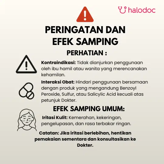 HARUS DENGAN RESEP DOKTER. Hindari kontak dengan mata, hidung, tenggorokan, dan membran mukosa; pemaparan berlebihan terhadap sinar matahari. Produk yang mengandung alkohol berkadar tinggi. Ibu Hamil dan laktasi. Kategori kehamilan: Kategori C: Mungkin berisiko. Obat digunakan dengan hati-hati apabila besarnya manfaat yang diperoleh melebihi besarnya risiko terhadap janin. Penelitian pada hewan uji menunjukkan risiko terhadap janin dan belum terdapat penelitian langsung terhadap wanita hamil.