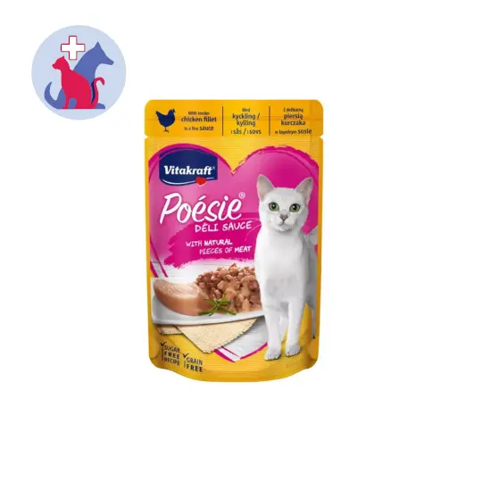 VITAKRAFT POESIE DELI SAUCE WITH TENDER CHICKEN FILLET merupakan makanan basah khusus untuk kucing dewasa dengan rasa daging ayam dalam saus yang lezat agar nutrisi harian dapat terpenuhi