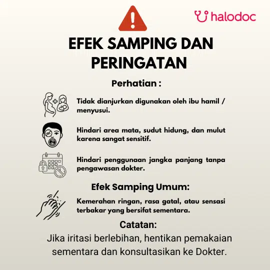 Efek samping yang mungkin terjadi dalam penggunaan obat adalah: Erythema, rasa terbakar, kemerahan atau gatal pada kulit.