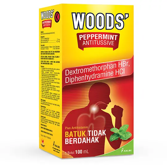 WOODS PEPERMINT ANTITUSSIVE SIRUP mengandung Dextromethorphan HBr dan Diphenhydramine HCl. Dextromethorphan HBr sebagai antitusif bekerja dengan cara menekan sentral batuk sedangan Diphenhydramine HCl adalah antihistamine yang bekerja dengan cara memblok histamin pada reseptor H1.