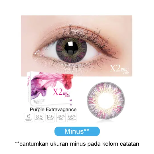 Softlense X2 Bio FOUR merupakan softlense untuk penggunaan 6 Bulan. Softlense ini memiliki 4 pilihan warna yaitu Purple Extravagance, Grey diamond, Chocolate mousse, dan Green mango. Softlense ini memiliki diameter 14.5 mm dan kadar air 45% sehingga memberikan rasa nyaman saat penggunaan.