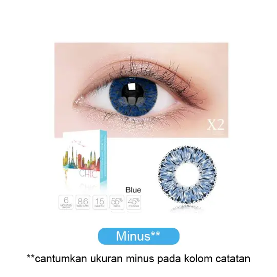 Softlens X2 CHIC merupakan softlense dengan masa penggunaan 6 Bulan. Softlens ini memilki 4 varian warna yaitu Blue, Brown, Green, dan Grey. Softlense ini memiliki kadar air 45% dan diameter 15 mm sehingga nyaman digunakan.