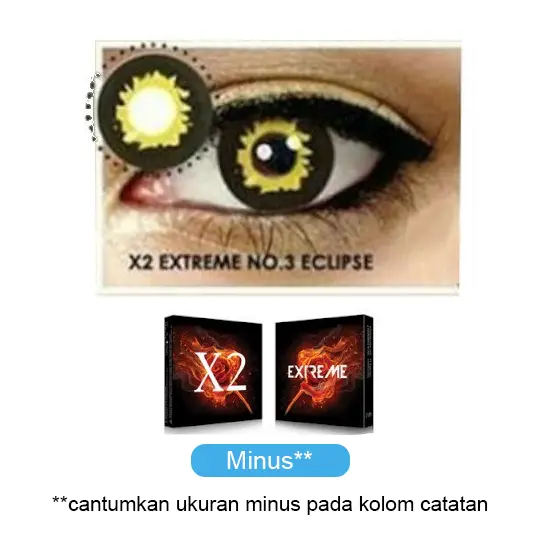 Softlense X2 EXTREME merupakan softlense dengan masa penggunaan selama 6 Bulan. Softlense ini memiliki 15 pilihan warna yaitu Vampire, Volturi, Eclipse, Darth Maul, Avatar, Voldemort, White Zombie, Raptor, Viper, Dragon Eyes, Twilight, Hellraiser, Cat Eye, Ceshire Cat, dan Black Out. Softlense ini memiliki diameter 14.5 mm dan kadar air 42% sehingga nyaman digunakan.