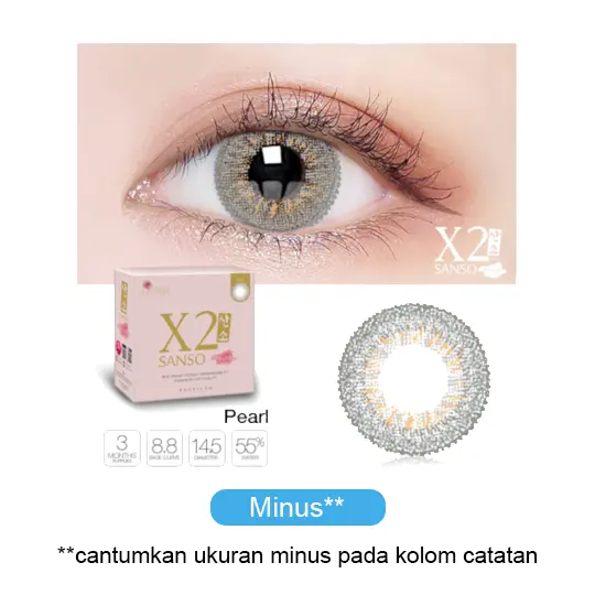 Softlense X2 Sanso merupakan softlense untuk penggunaan 6 Bulan. Softlense ini memiliki 5 pilihan warna yaitu Cappucino, Onyx, Pearl, Radiance, Shadow. Softlense ini memiliki diameter 14.5 mm dan kadar air 55% sehingga memberikan rasa nyaman saat penggunaan.