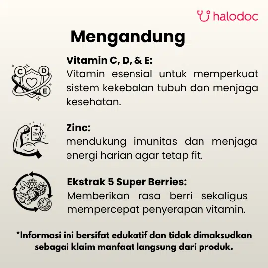 Produk ini mengandung kombinasi 10 Vitamin ((Vit A, C, D3, E, B kompleks) dan 3 Mineral esensial (Zinc, Selenium, Iodium). Vitamin B kompleks (B3, B5, B6, B12) yang berperan penting dalam metabolisme energi, membantu tubuh menghasilkan stamina dari makanan. Vitamin C dan Zinc berperan dalam membantu mendukung fungsi sistem kekebalan tubuh. Formula ini juga diperkaya 5 Ekstrak Super Berries (Goji, Strawberry, Blueberry, Raspberry, Cranberry) yang menyediakan antioksidan untuk melindungi sel-sel tubuh dari radikal bebas.