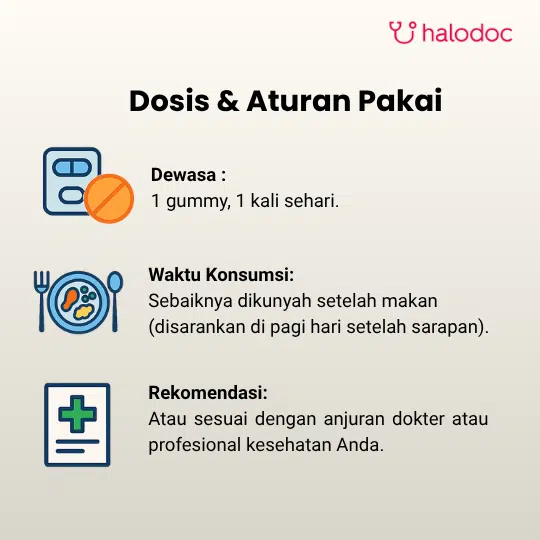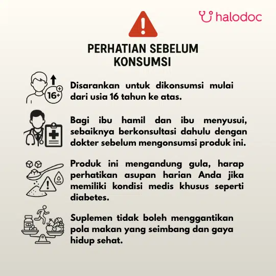 Jangan melebihi dosis anjuran untuk mencegah kelebihan vitamin/mineral. Konsultasikan dengan dokter jika sedang hamil atau menyusui. Suplemen tidak dapat menggantikan nutrisi dari pola makan yang seimbang.