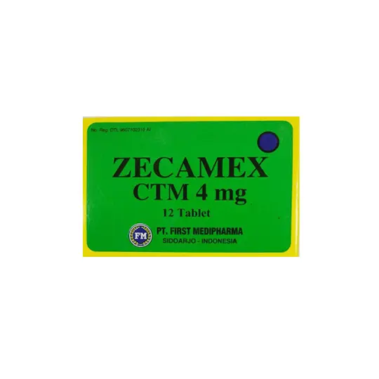 ZECAMEX TABLET merupakan obat antihistamin yang mengandung Chlorpheniramine maleate 4 mg. Obat ini digunakan untuk mengobati pilek, bersin-bersin, mata berair, gatal pada mata, hidung, tenggorokan atau kulit yang disebabkan oleh reaksi alergi, common cold, atau influenza. Zecamex bekerja sebagai antagonis reseptor histamin H1.