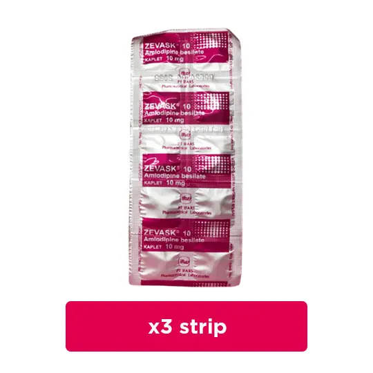 ZEVASK merupakan obat yang mendung amlodipin. Amlodipin merupakan obat antihipertensi Calcium Channel Blockers (CCB). Obat ini digunakan sebagai pengobatan lini pertama hipertensi dan dapat digunakan sebagai agen tunggal untuk mengontrol tekanan darah pada sebagian besar pasien. Pasien yang tidak cukup terkontrol dengan obat antihipertensi tunggal (selain amlodipin) dapat memperoleh manfaat dari penambahan amlodipin, yang telah digunakan dalam kombinasi dengan diuretik thiazide, blocker, adrenoceptor blocking agent, atau ACE inhibitor. Pengobatan lini pertama iskemia miokard baik karena obstruksi tetap (angina stabil) dan atau vasospasme/vasokonstriksi (angina Prinzmetal atau varian) atau pembuluh darah koroner. Dapat digunakan jika presentasi klinis menunjukkan kemungkinan vasospastik/vasokonstriksi belum dikonfirmasi. Sebagai monoterapi atau kombinasi dengan obat antiangina lain pada pasien dengan angina yang refrakter terhadap nitrat dan atau penyekat dosis memadai. Dalam penggunaan obat ini harus SESUAI DENGAN PETUNJUK DOKTER. Pembelian obat ini memerlukan edukasi terkait penggunaan atau pengonsumsian obat yang tepat dan aman yang akan dikenakan biaya.